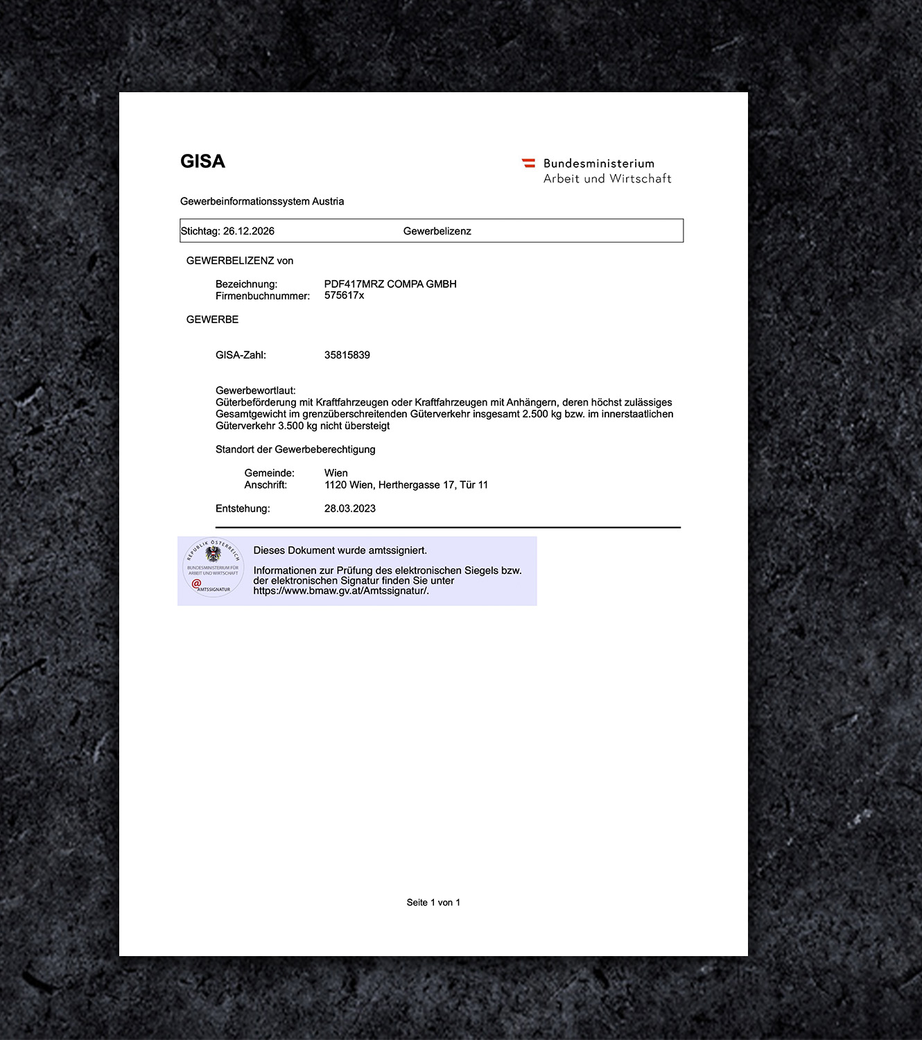Fake Austria Certificate of Incorporation BL Business License PDF Template Description