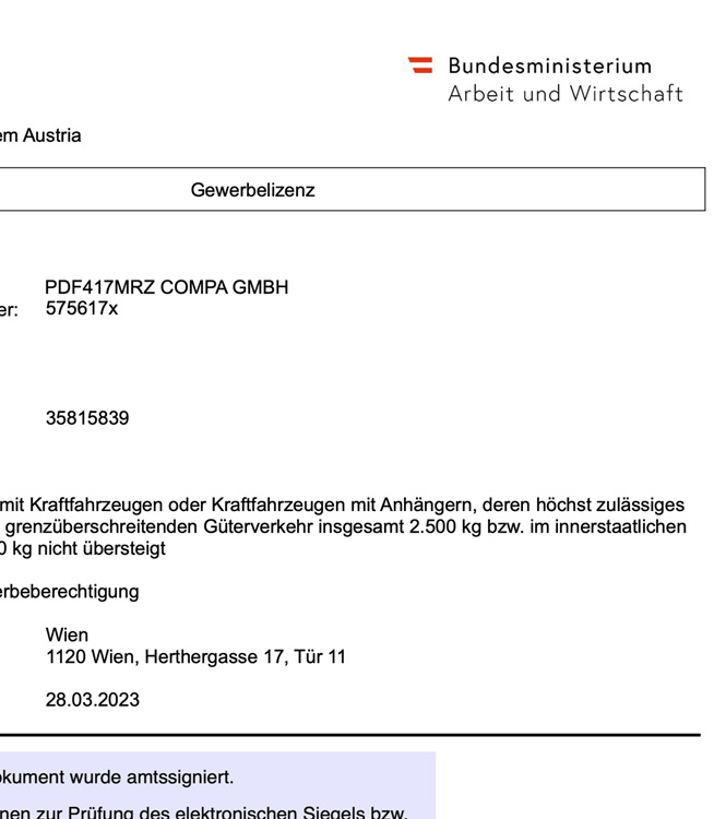 Features of Austria Certificate of Incorporation BL Business License PDF Template