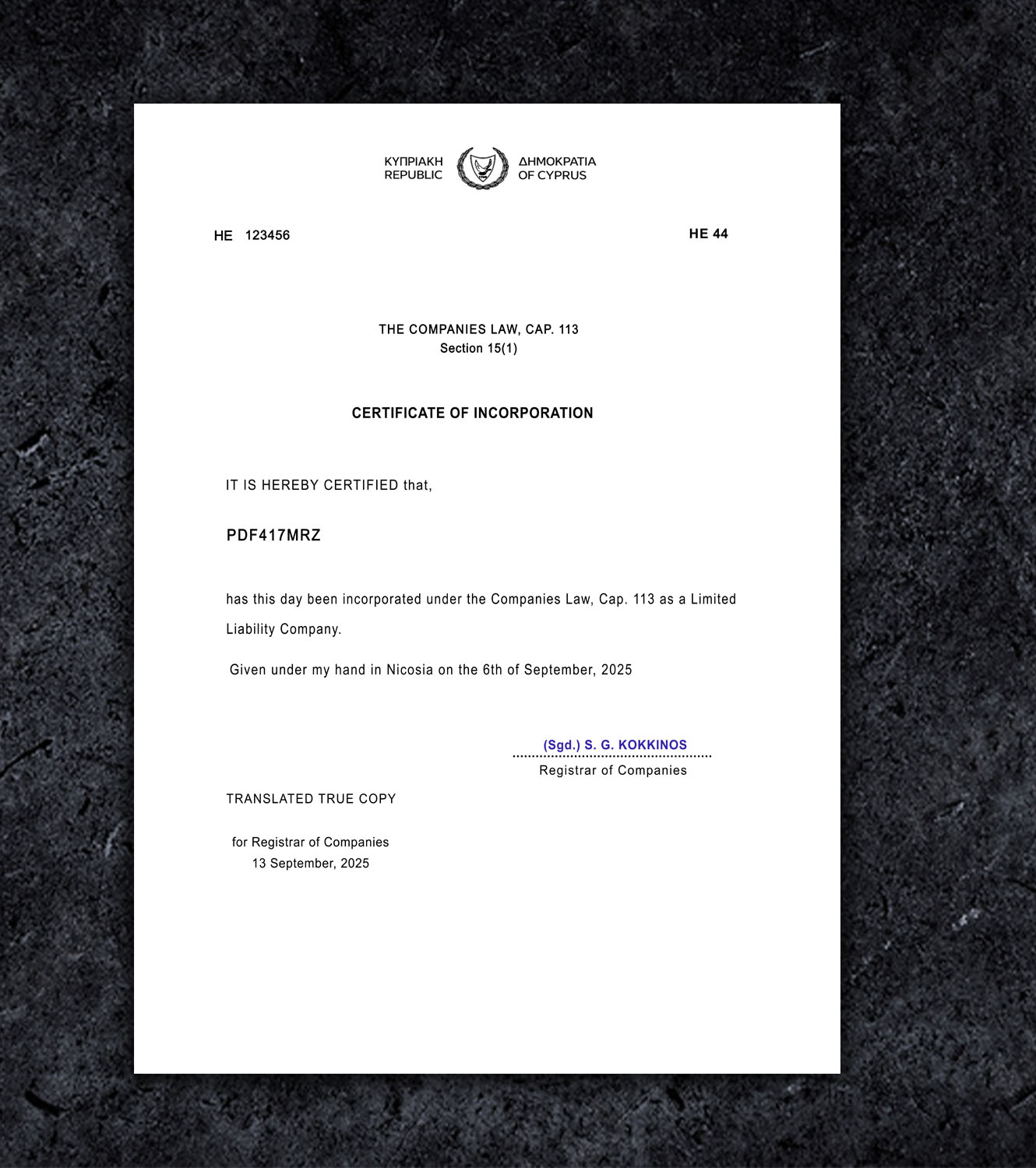 Features of Cyprus Certificate of Incorporation BL Business License PSD Template
