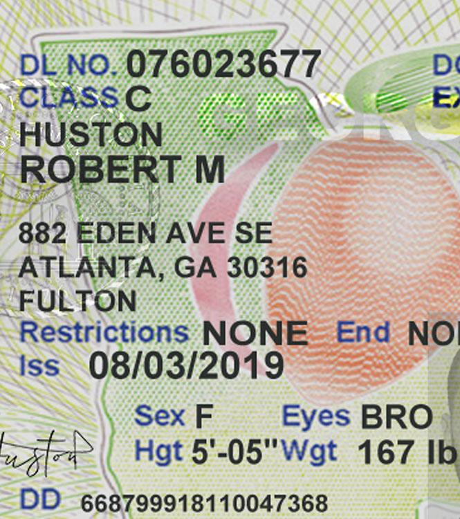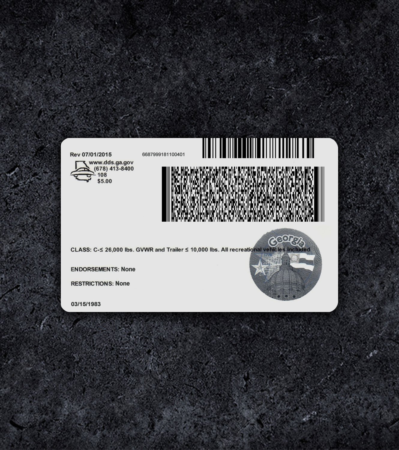 Our fully editable, high-quality Photoshop template makes it easy to design a professional-looking Georgia GA Driver License PSD Template - 2015. Simply personalize the template with your name, address, document number, date of birth, height, weight, photo, signature, PDF417 barcode, and expiration date.