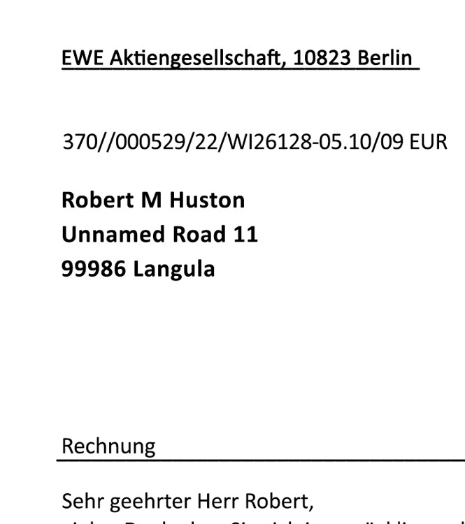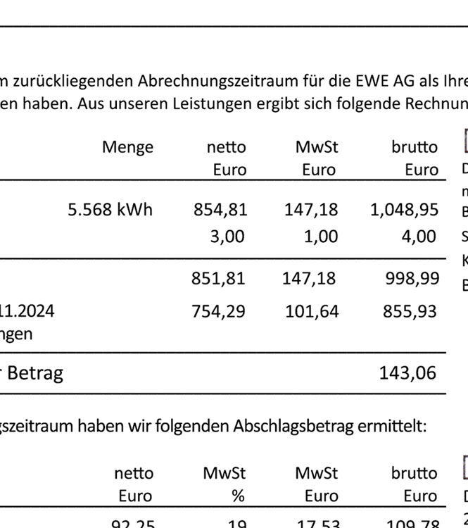 Our fully editable, high-quality PDF template makes it easy to design a professional-looking Ewe Germany DEU Bill PSD Template - 2024. Simply personalize the template with your name, address and period of time.