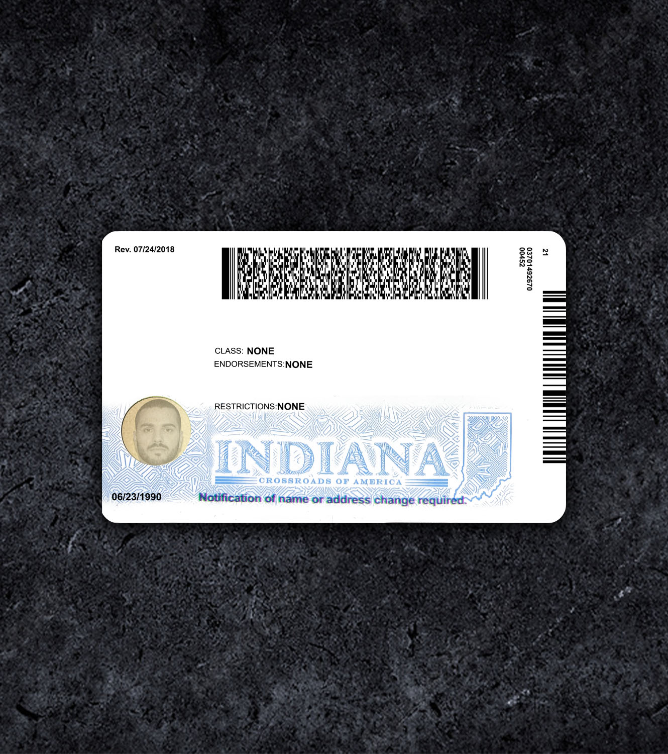 Our fully editable, high-quality Photoshop template makes it easy to design a professional-looking Indiana Driver License PSD Template - 2018. Simply personalize the template with your name, address, document number, date of birth, height, weight, photo, signature, PDF417 barcode, and expiration date.