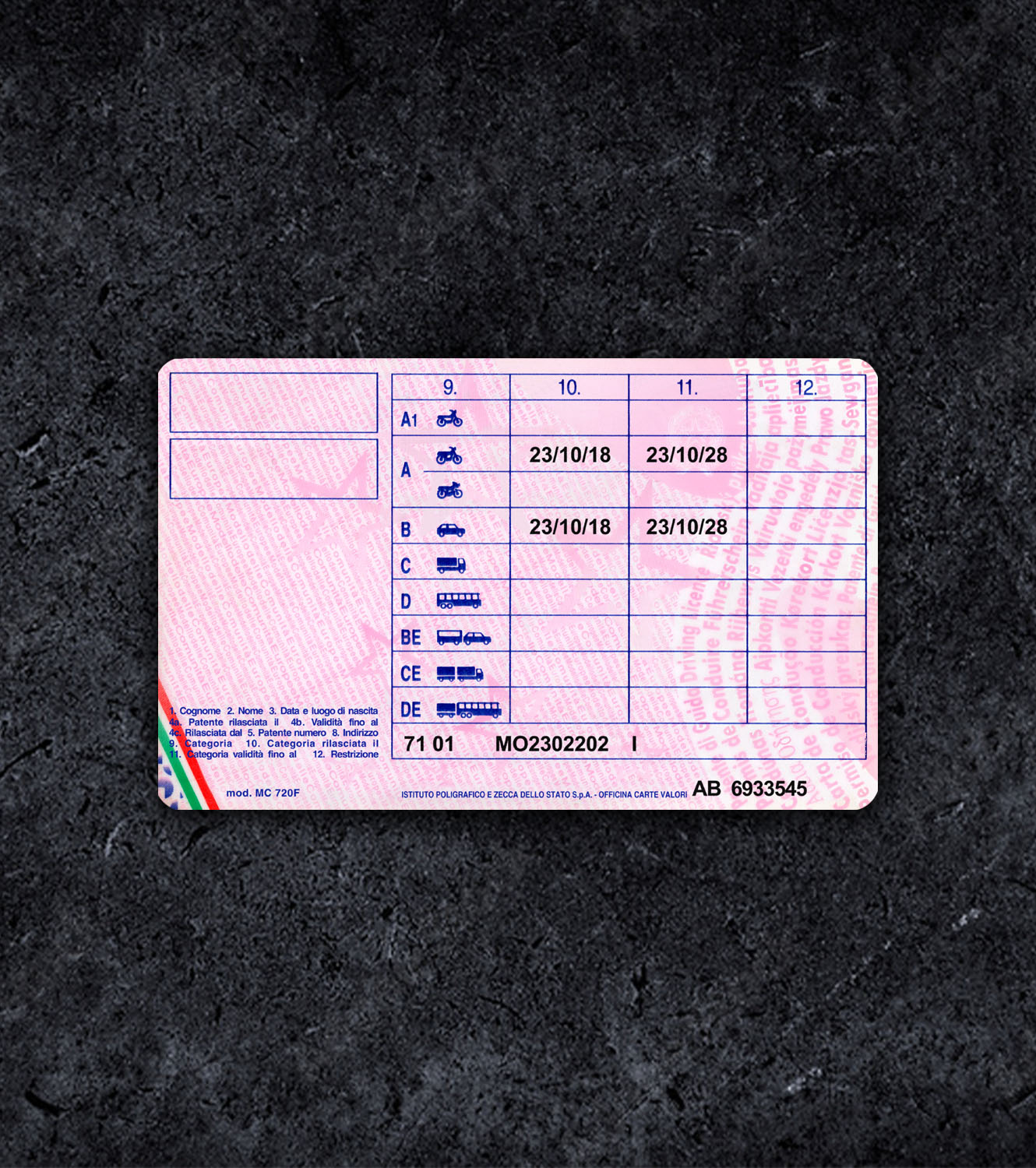 Our fully editable, high-quality Photoshop template makes it easy to design a professional-looking Italy Driver License PSD Template - 2002. Simply personalize the template with your name, address, document number, date of birth, height, weight, photo, signature, PDF417 barcode, and expiration date.