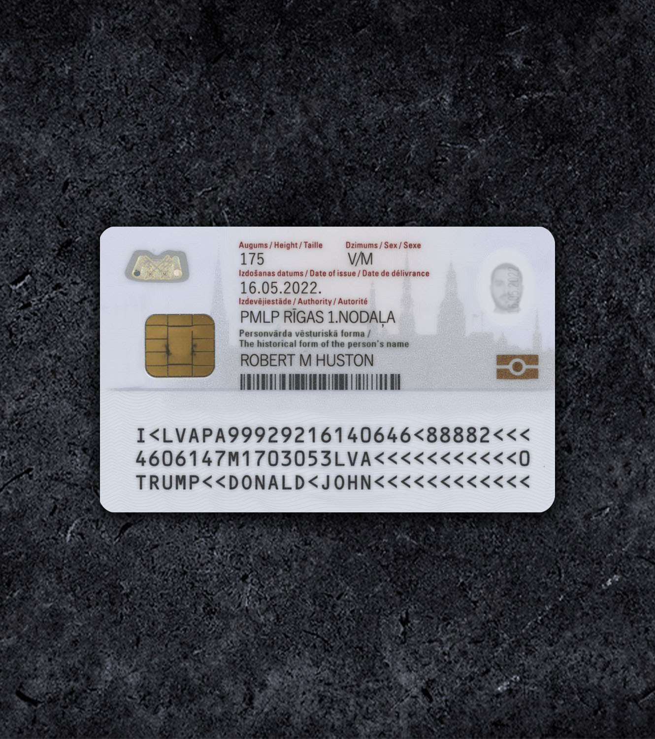 Our fully editable, high-quality Photoshop template makes it easy to design a professional-looking Latvia LV ID Card PSD Template - 2012. Simply personalize the template with your name, document number, date of birth, height, weight, photo, signature, MRZ line, and expiration date.