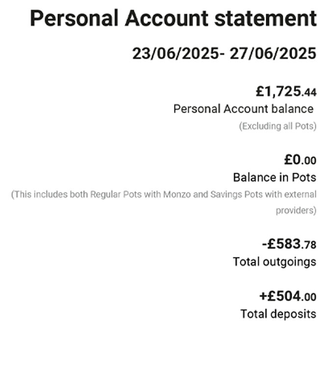 Fake Monzo United Kingdom UK Statement PDF Template - 2025 Description