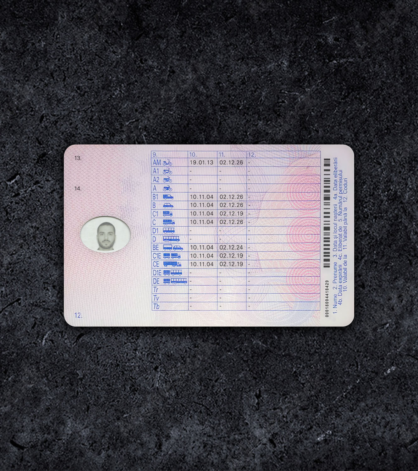 Our fully editable, high-quality Photoshop template makes it easy to design a professional-looking Romania Driver License PSD Template - 2013. Simply personalize the template with your name, address, document number, date of birth, height, weight, photo, signature, PDF417 barcode, and expiration date.